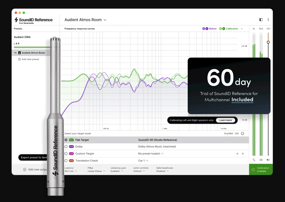 L’ORIA Mini s’appuie sur SoundID Reference de Sonarworks pour la partie mesure et génération de la courbe de correction. Le bundle complet inclut un micro de mesure calibré et une licence SoundID Reference pour enceintes et casques. La procédure de calibration suit les grandes étapes suivantes :
