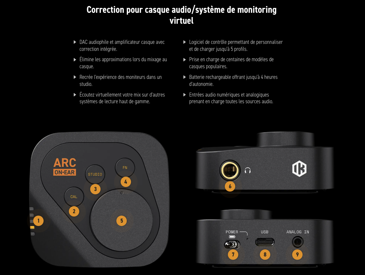 Plutôt que de proposer un simple plug-in de correction, IK Multimedia choisit de déplacer l’intelligence dans le matériel. ARC ON·EAR est un système complet qui se compose :